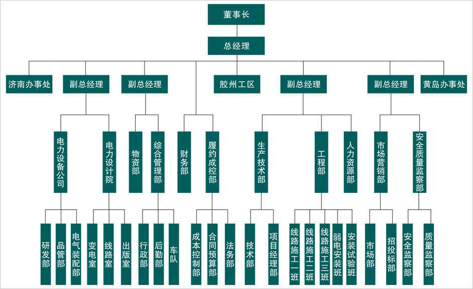 总公司下设电力设计院、电力工程施工公司、电力设备公司、济南办事处、黄岛办事处等分支机构。现有员工150余人,具有大专及以上学历120人,拥有电力相关高级工程师16人,中级工程师23人,一级注册建造师8人,二级注册建造师19人,持电工进网许可证人员90人。